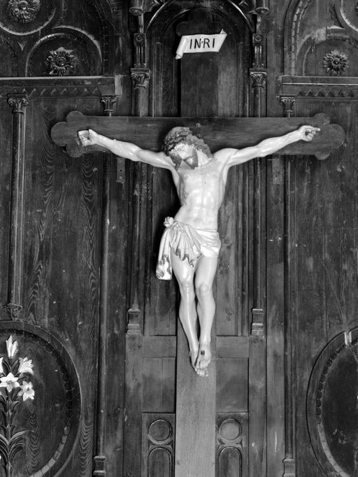 Autel-retable, statue de Christ en croix.Immatriculation