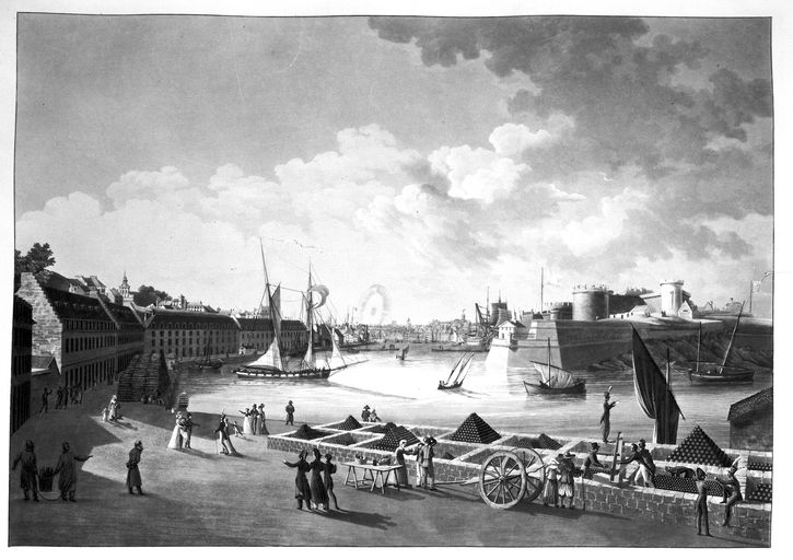Vue du port de Brest prise du parc aux Vivres : au premier plan un parc à boulets, 1821, par Louis Garneray, série des 24 vues des ports de FranceImmatriculation