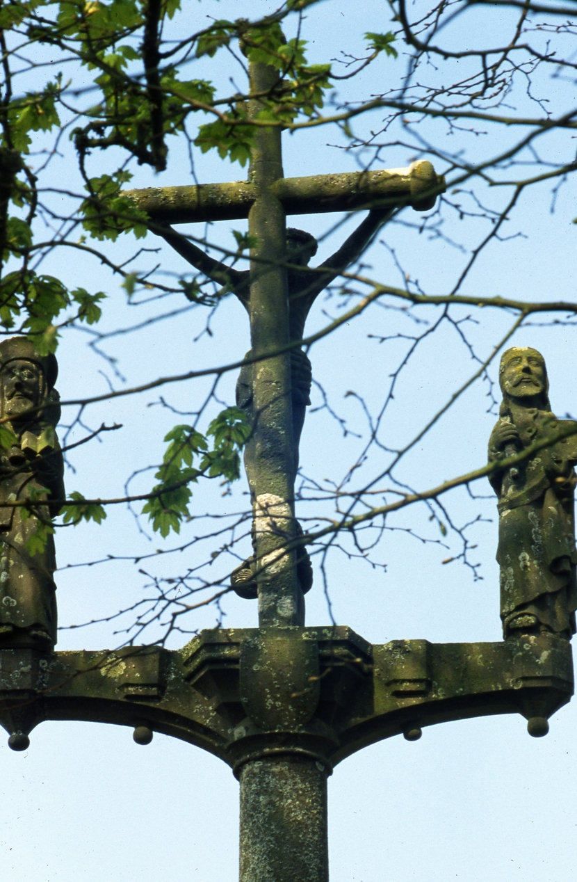 Calvaire, détail du revers : saint Jacques et saint Pierre.Immatriculation