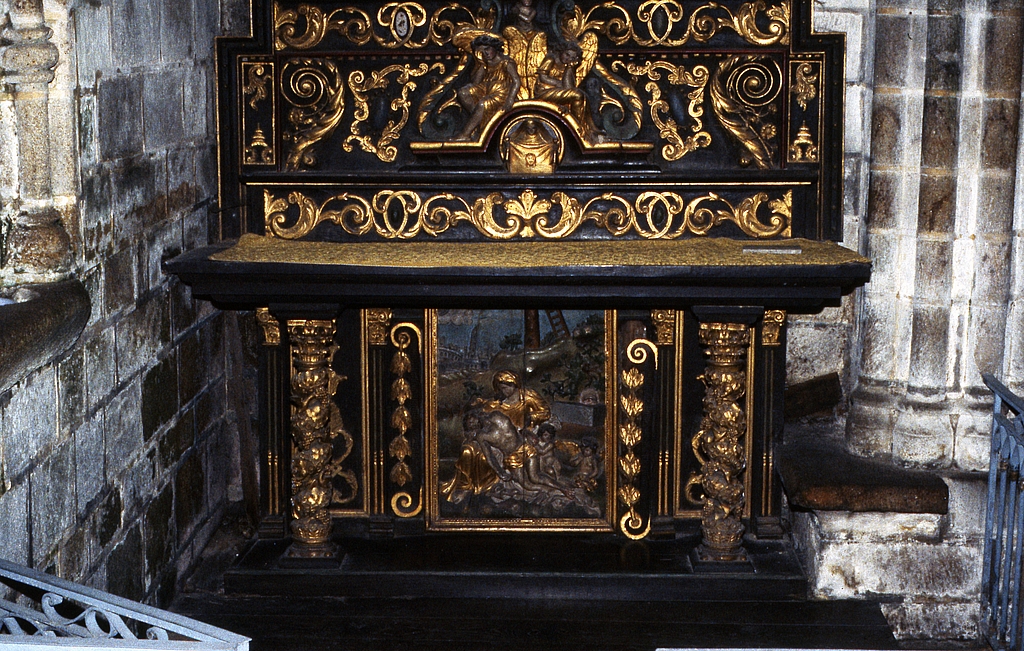 Autel, gradin d'autel, thabor (autel secondaire, autel table), de Notre-Dame de Pitié, (anciennement retable numéro 5), église paroissiale Notre-Dame-de-Roscudon (Pont-Croix),