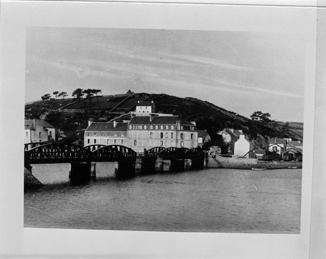 Premier pont dit "pont métalique", vue générale prise de l'est côté Poulgoazec. (Gare d'audierne en arrière plan). Reproduction carte postale début du 20e siècle. (Coll. Villard Quimper)Immatriculation