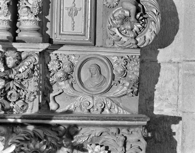 Détail partie droite, médaillon avec la ViergeImmatriculation
