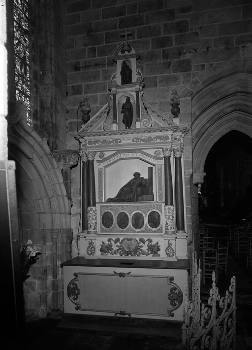 Autel, retable, ronde-bosse, statue, groupe sculpté (autel secondaire, autel tombeau, retable architecturé à niche), de saint pierre, (anciennement retable numéro 2), église paroissiale Notre-Dame-de-Roscudon (Pont-Croix),