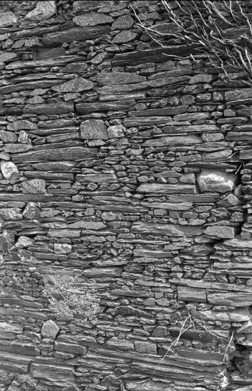Etable, détail de l'appareil du pignon.Immatriculation