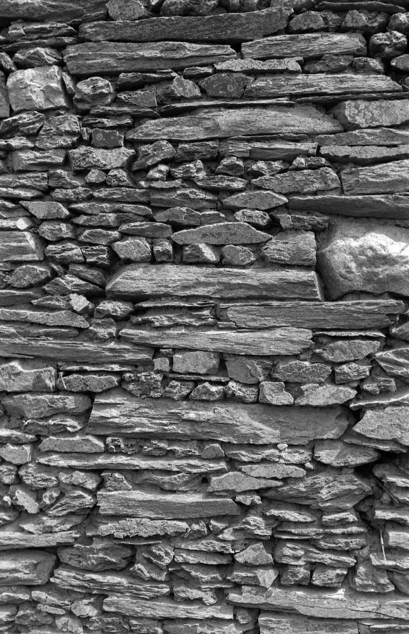 Etable, détail de l'appareil du pignon.Immatriculation