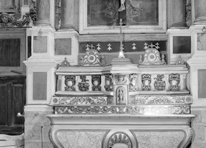 Autel, retable, tabernacle, gradins d'autel (2), (maître-autel, autel tombeau, retable architecturé, tabernacle à ailes), église paroissiale Notre-Dame-de-Lorette (Séglien),
