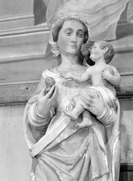 Statue de Vierge à l'Enfant, détail du buste.Immatriculation
