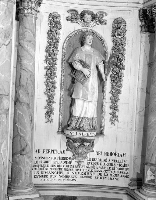 Statue (2, d'applique, en pendant, petite nature) : saint Etienne, saint Laurent, chapelle Notre-Dame-de-Carmes (Neulliac),