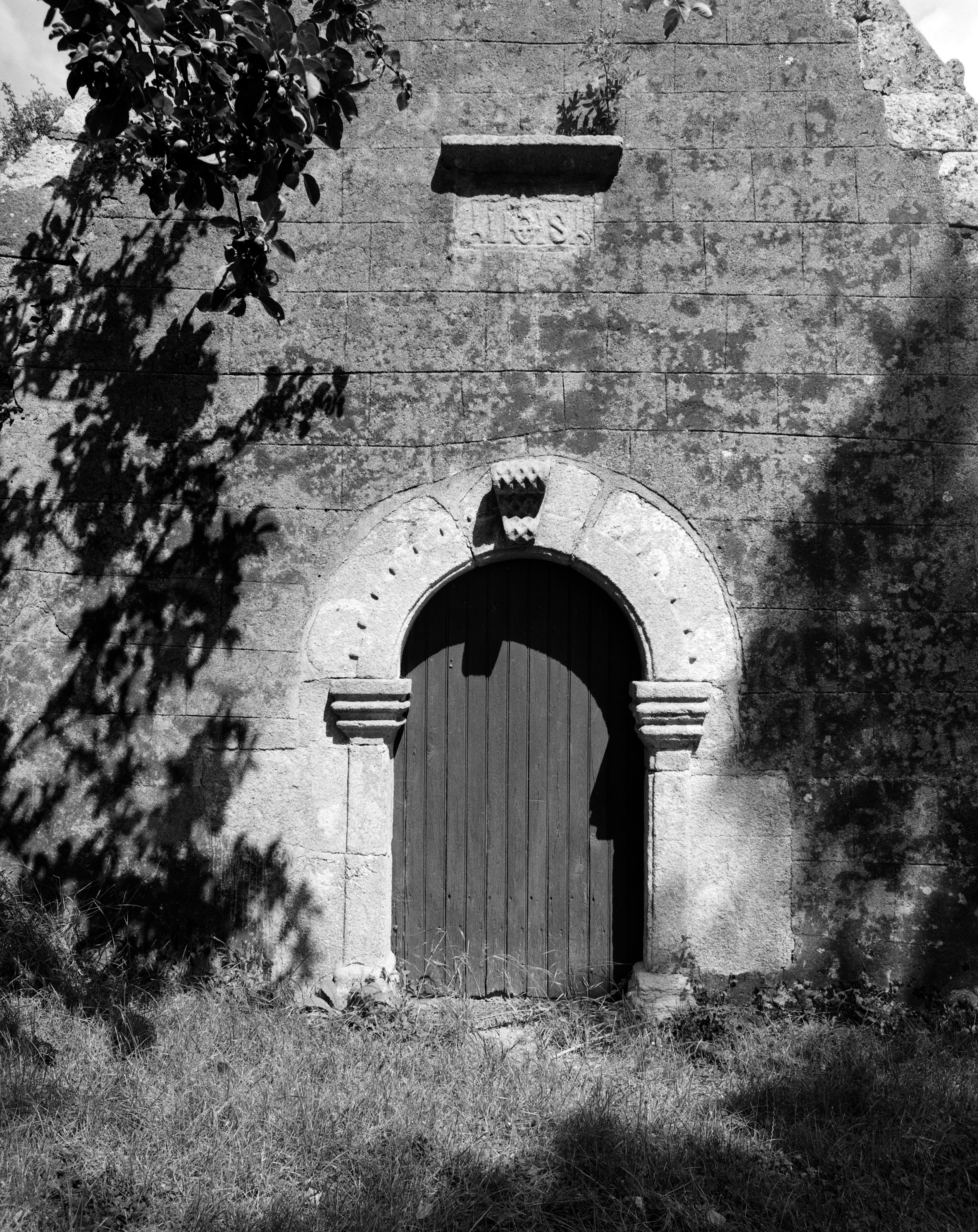 Elévation ouest, détail de la porte et sigle religieux IHS. (1984)Immatriculation