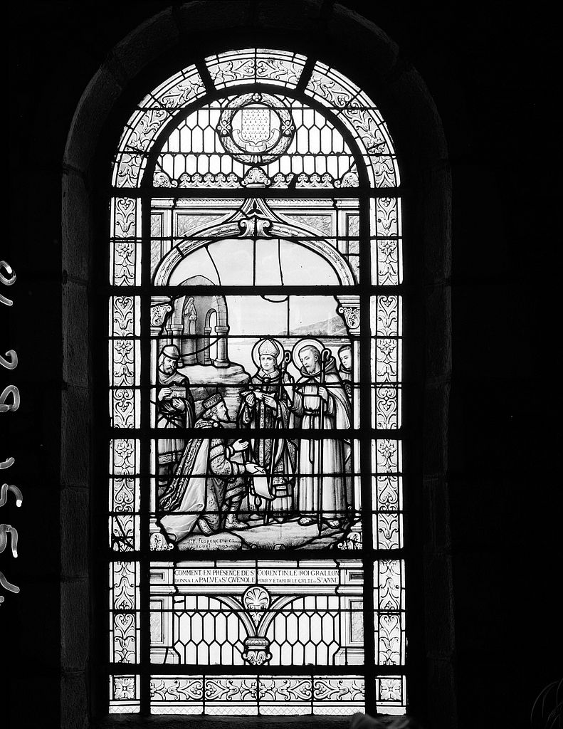 Verrière (5, verrière figurée) : vie du roi Gradlon, vie de saint Collodan, Baptême du Christ (baies 3, 4, 5, 6, 9), église paroissiale Saint-Collodan (Plogoff),