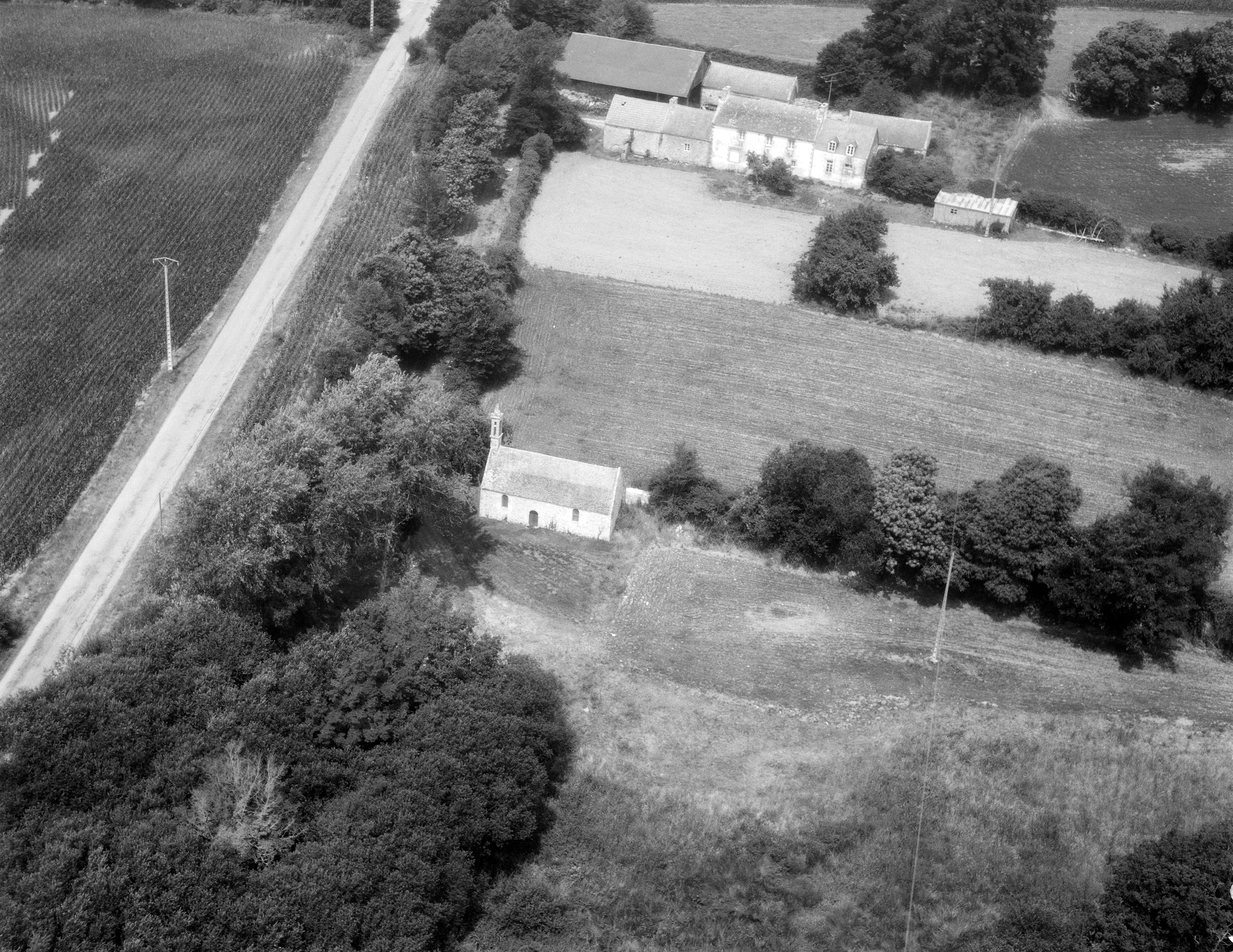 Vue aérienne sud : chapelle et village de Sanspé. (1984)Immatriculation
