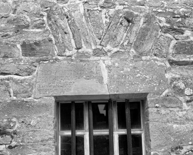 Elévation sud du clocher, date inscription sur le linteau.Immatriculation
