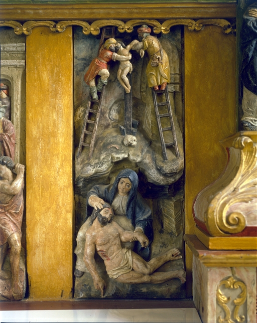 Autel et retable sud, panneau sculpté : Vierge de Pitié.Immatriculation