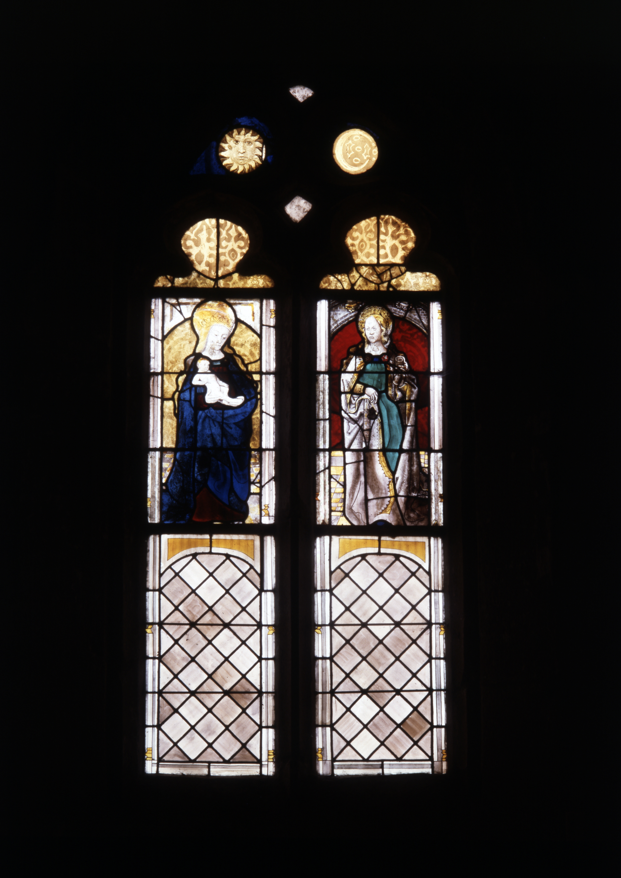Verrière de la baie 1 : Vierge à l'Enfant et sainte non identifiée (état en 1984)Immatriculation