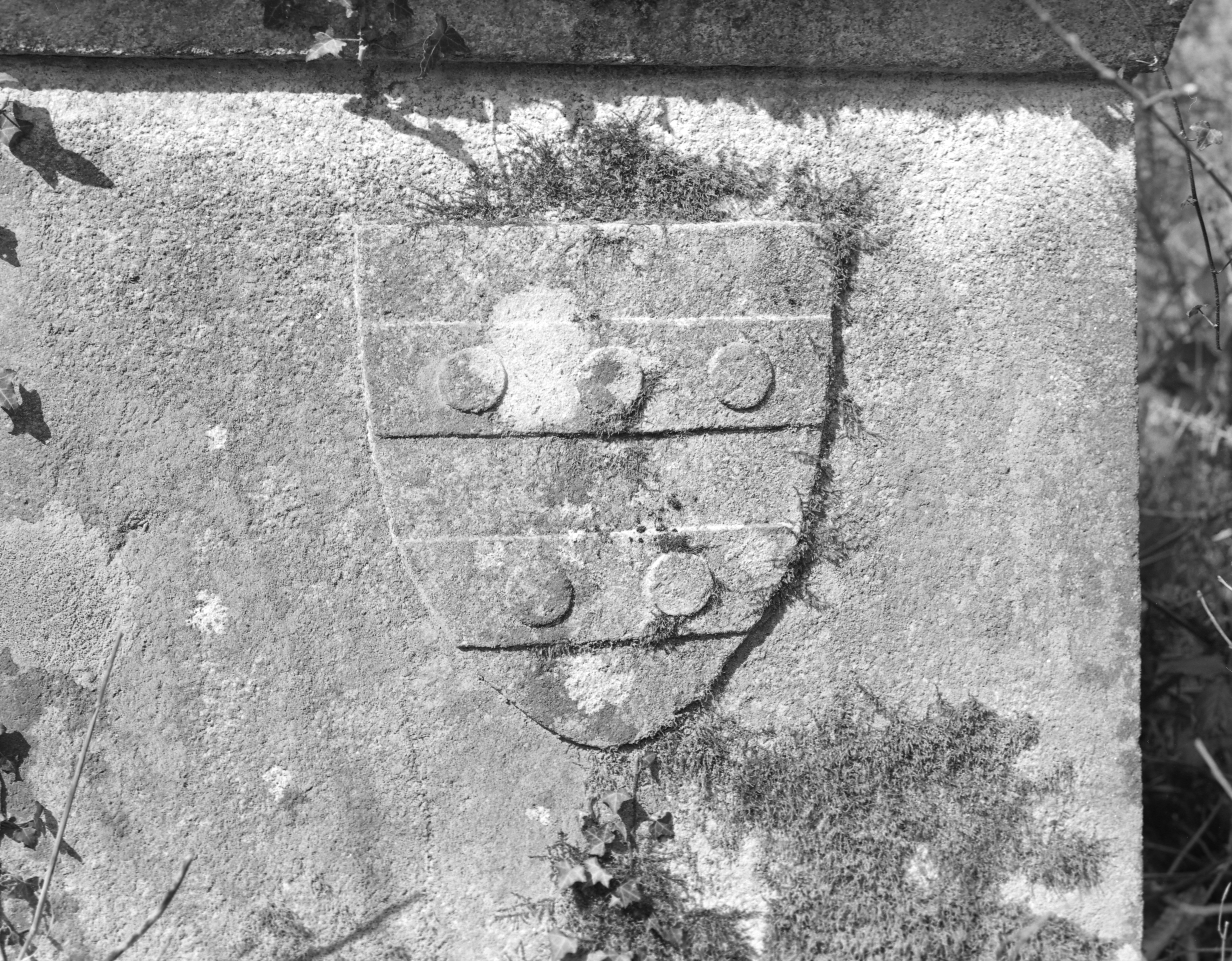 Croix de chemin, socle : armoiries de la famille du Boisbaudry (état en 1984)Immatriculation