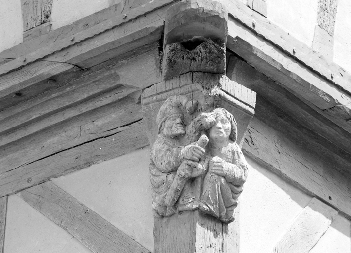 Angle sud-ouest, 1er étage, décor de l'aisselier : homme et femme (état en 1984)Immatriculation