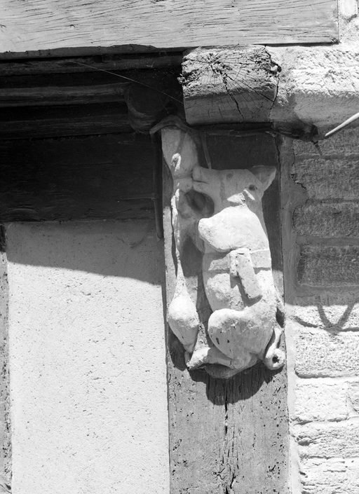 Elévation sud, rez-de-chaussée, décor du poteau d'huisserie : la truie qui file (état en 1984)Immatriculation