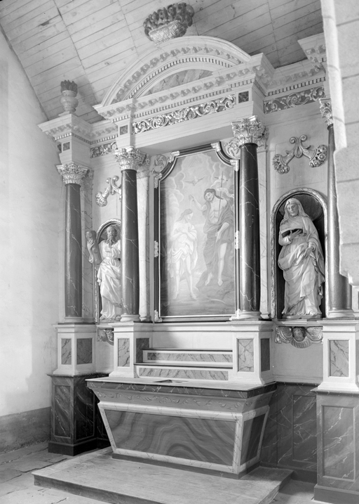 Ensemble de l'autel secondaire nord : autel, retable, 2 gradins d'autel, chapelle Saint-Golven, le Vieux-Bourg (Taupont),