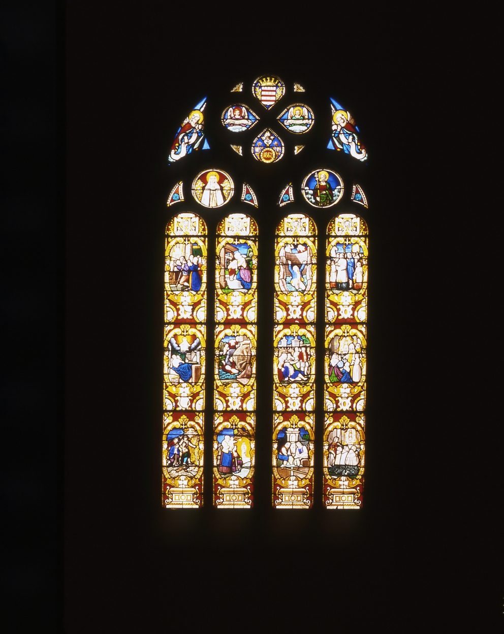 Verrières (8) : vie du Christ (baies 1 à 8), verrière à personnages, église paroissiale Notre-Dame du Roncier (Rostrenen),