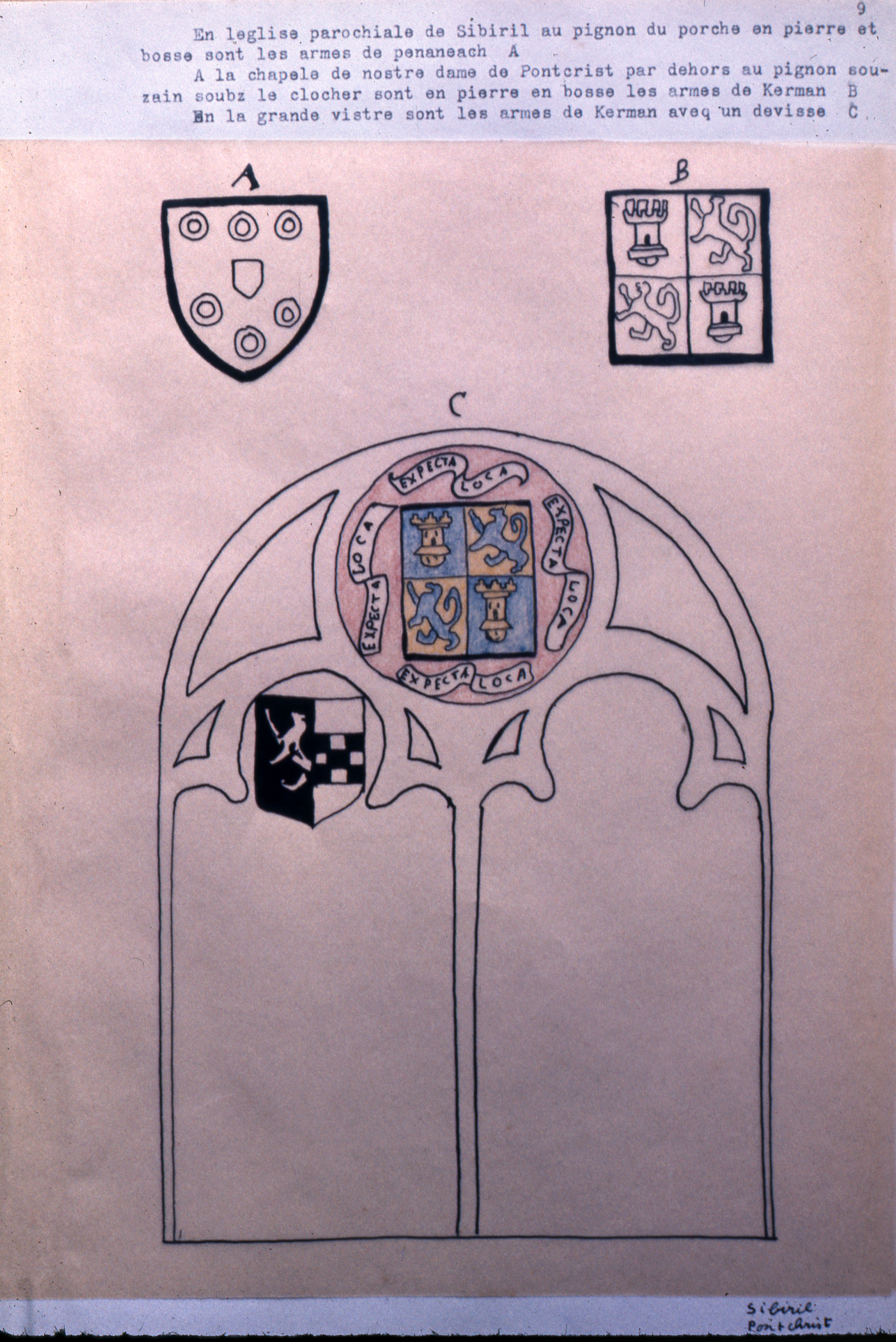 Chapelle, sous le clocher (en B) : armes des Kerman sculptées ; maîtresse-vitre (en C) : armes et devises (dessin, 1614)Immatriculation