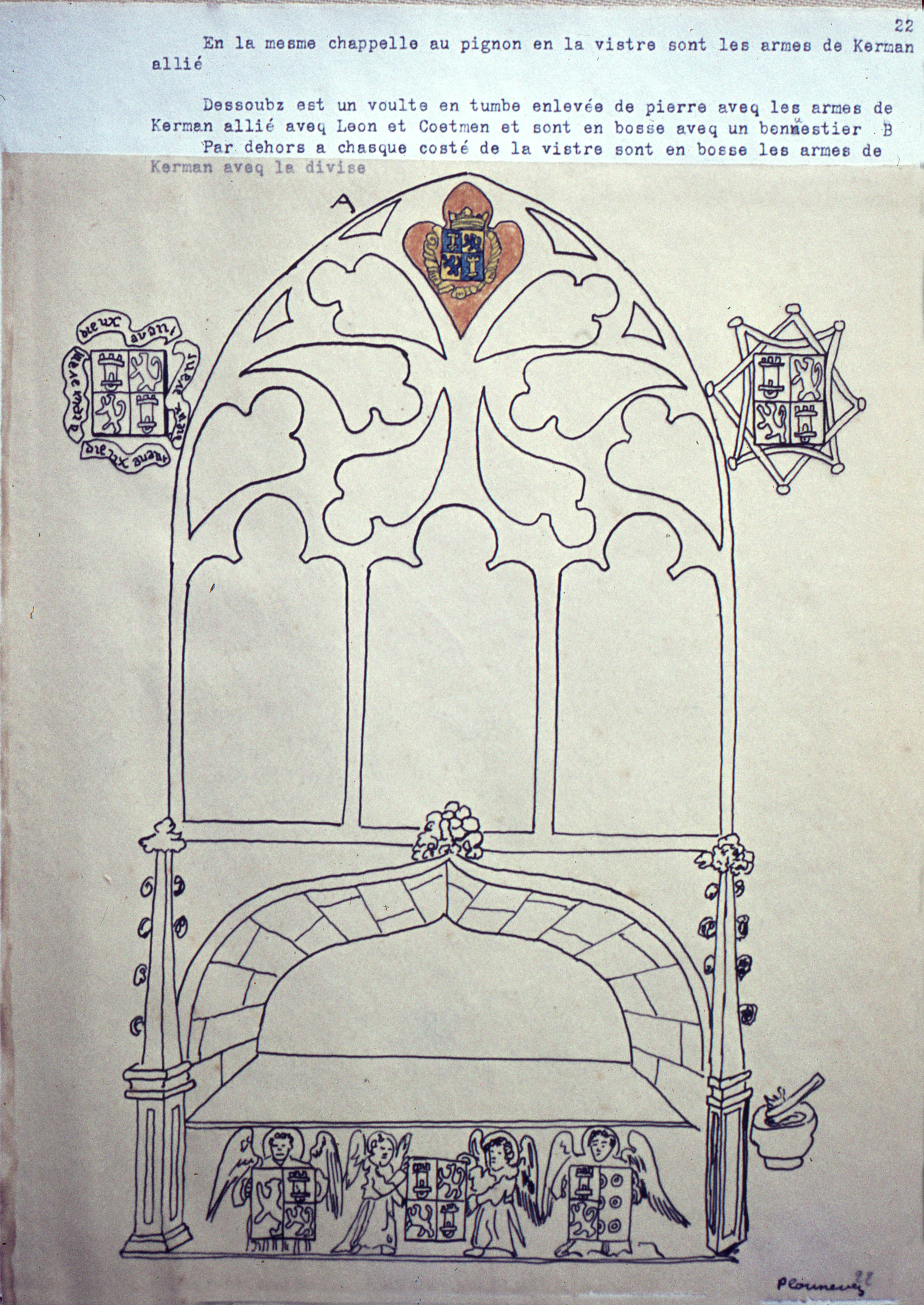 BOURICQUEN, Jan. Bref estat es preminences du marquis de Kerman et conte de Seszploe de mesme quelles sont es eglisses covent et chapelles tant en pierre boys viltres que lisières en Leon. Visite recuilli es ce presant livre faict pour hault et puissant mesire Charles de Maillé chevalier de l'Ordre du roy, gentilhomme ordinaire de sa chambre, seigneur marcquis de Kerman conte de Seizploue, baron de la Forest, [etc], par son peintre et vistrier humble et fidel serviteur Jan Bouricquen en 1614.