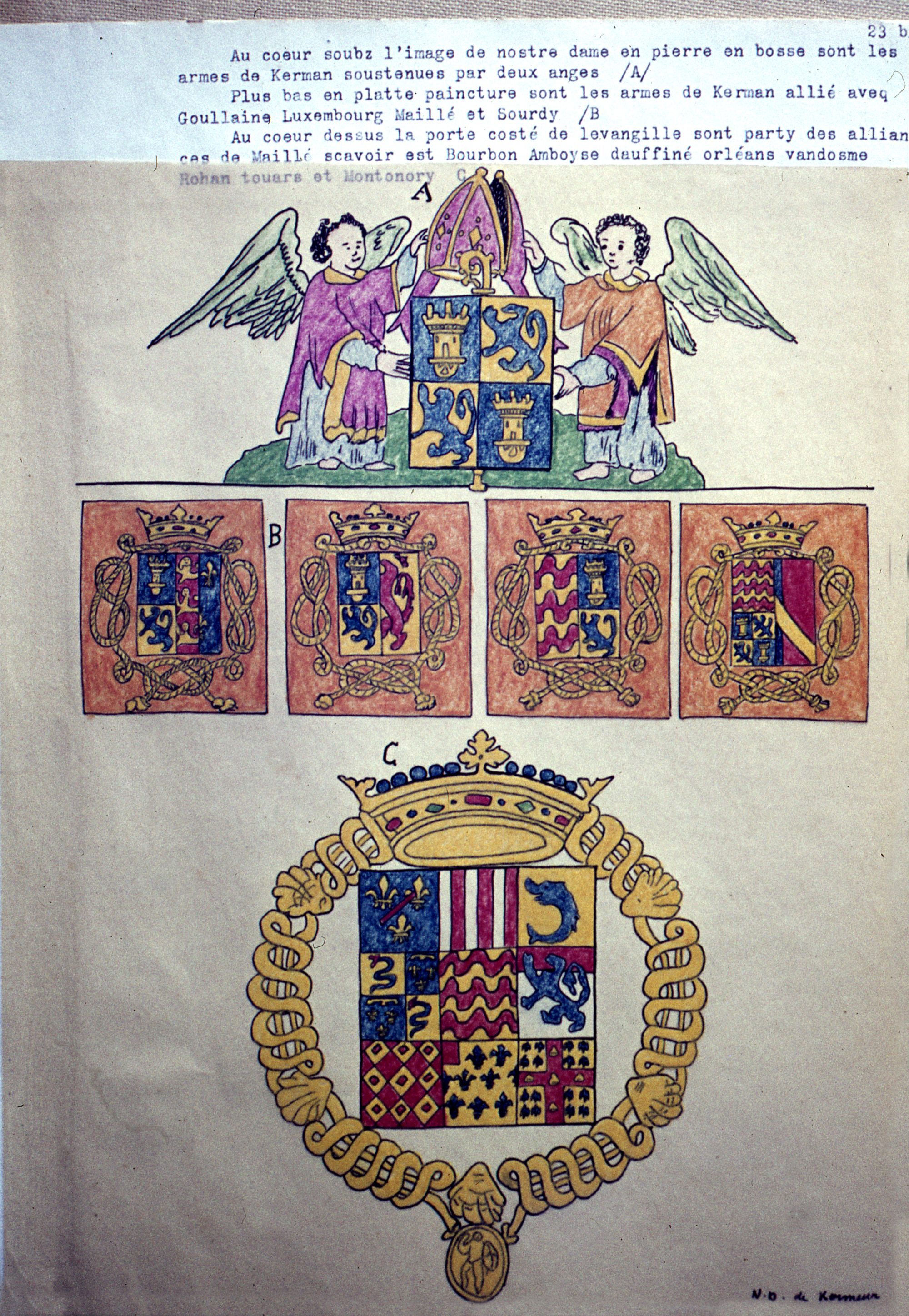 Château, ancienne chapelle Notre-Dame de Kerveur, dans le chœur, sculpture : armoiries de l’évêque Jean de Carman soutenues par deux anges ; dessous, peinture : armoiries des familles alliées : Goulaine, Luxembourg, Maillé et Sourdy ; dans le chœur, au-dessus de la porte, côté évangile, armoiries des familles alliées avec Maillé : Bourbon, Amboise, Dauphiné, Orléans, Vendôme, Rohan, Thouars et Montléry (dessin, 1614)Immatriculation