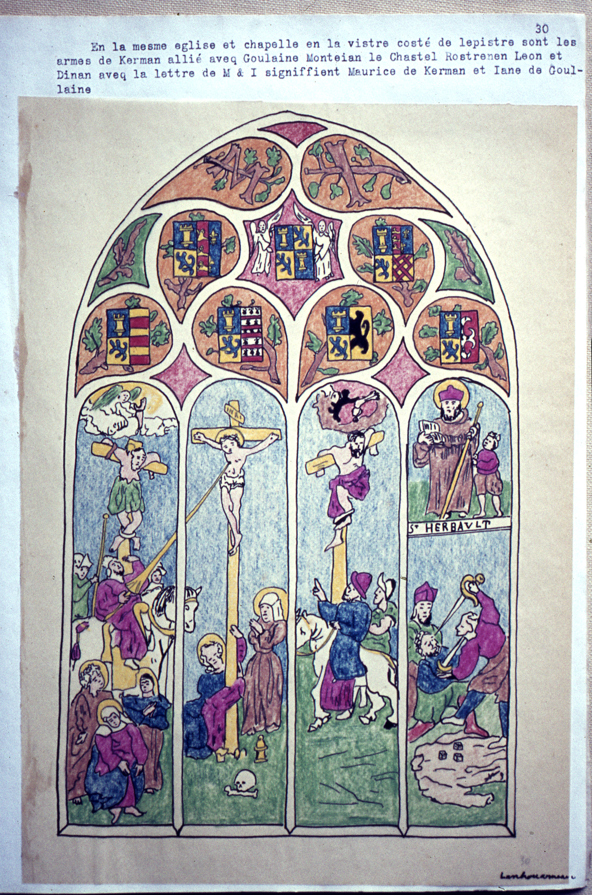BOURICQUEN, Jan. Bref estat es preminences du marquis de Kerman et conte de Seszploe de mesme quelles sont es eglisses covent et chapelles tant en pierre boys viltres que lisières en Leon. Visite recuilli es ce presant livre faict pour hault et puissant mesire Charles de Maillé chevalier de l'Ordre du roy, gentilhomme ordinaire de sa chambre, seigneur marcquis de Kerman conte de Seizploue, baron de la Forest, [etc], par son peintre et vistrier humble et fidel serviteur Jan Bouricquen en 1614.