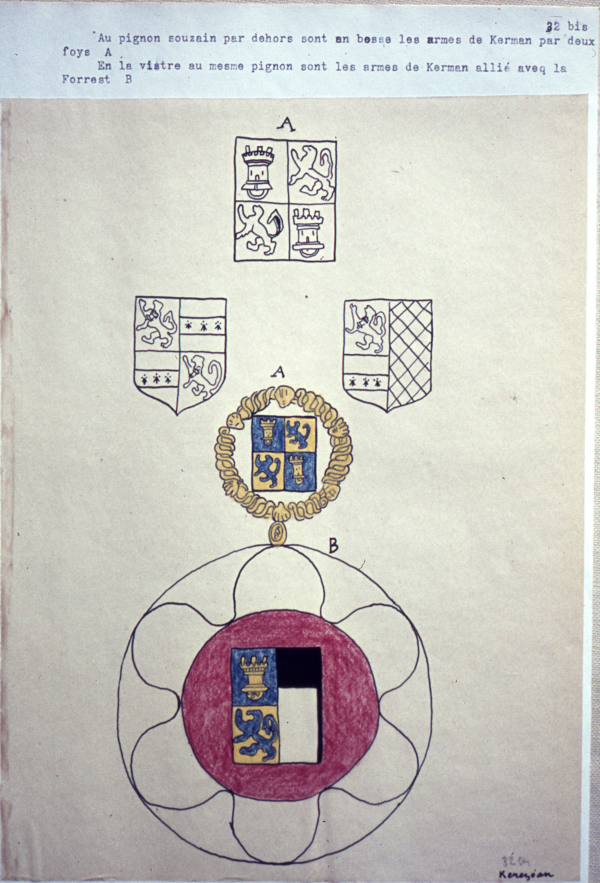 Chapelle ND de Kerzéan : dessin des armoiries qui étaient sur le mur-pignon ouest (dessin, 1614)Immatriculation