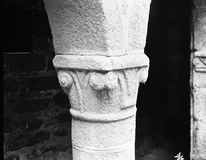 Vue de la cour et de la galerie d'arcades en arc plein cintre : angle sud-est, détail du chapiteau de l'une des colonnes (état en 1985)Immatriculation