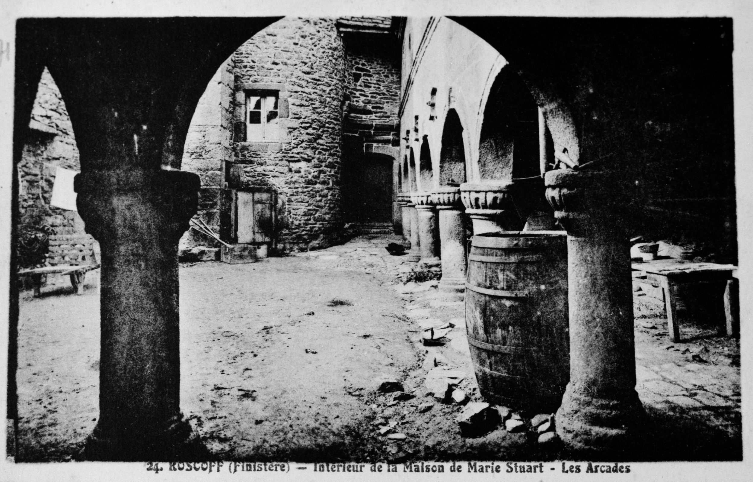 Vue de la cour avec sa galerie servant de remise comprenant des arcades en arc plein cintre, élévation nord et est, carte postaleImmatriculation