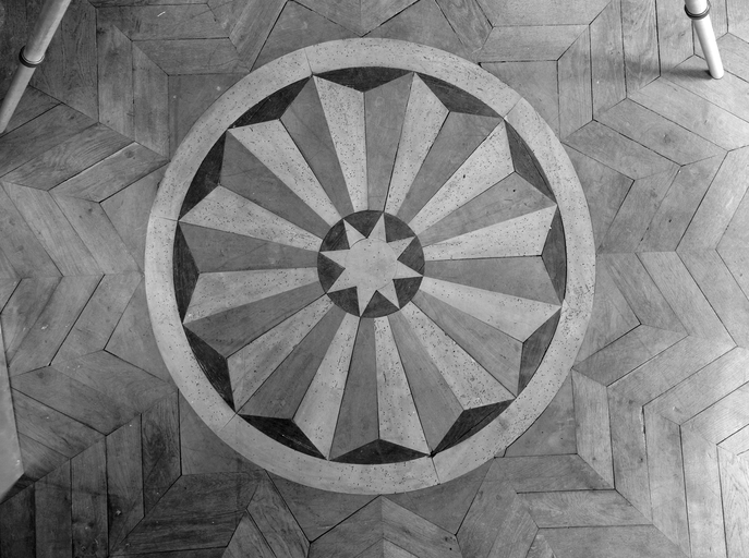 32 rue Nationale, 1er étage, salle sur rue, parquet, motif central, vue de détail.Immatriculation