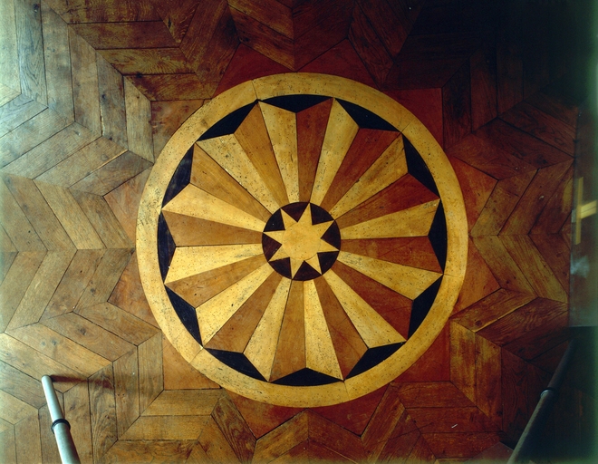 32 rue Nationale, 1er étage, salle sur rue, parquet, motif central, vue de détail.Immatriculation