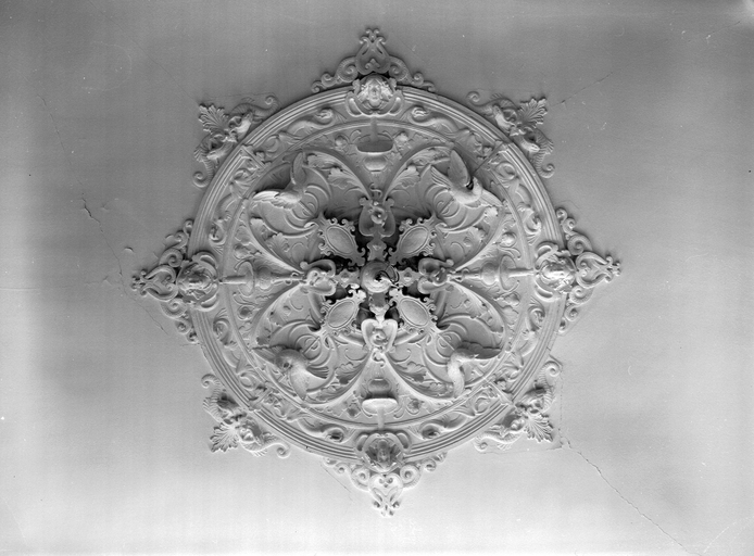 32 rue Nationale, 2ème étage, pièce sur jardin, plafond, décor, partie centrale, vue de détail.Immatriculation