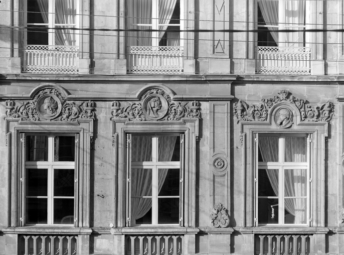 32 rue Nationale, détail d'un linteau à têtes sculptées.Immatriculation
