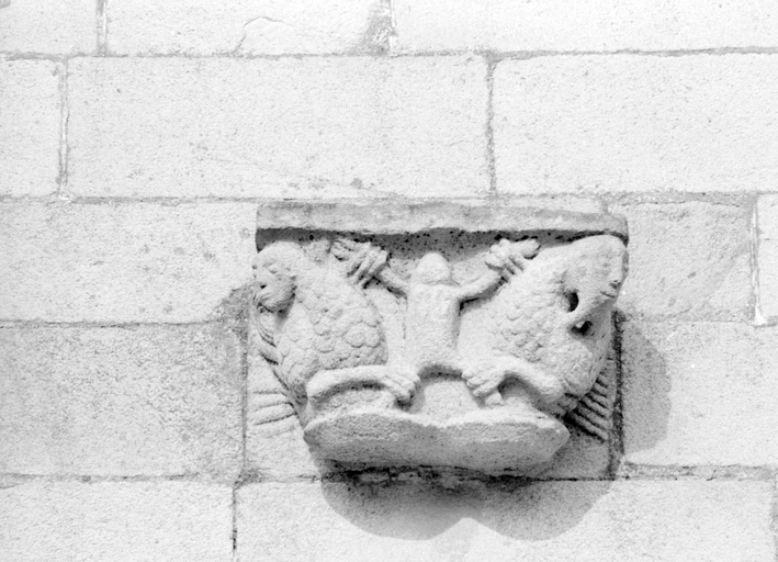 Nef, élévation sud, 1ère travée à partir de l'ouest, chapiteau double : deux sphinx tenant un lapin par les pattes (état en 1984)Immatriculation