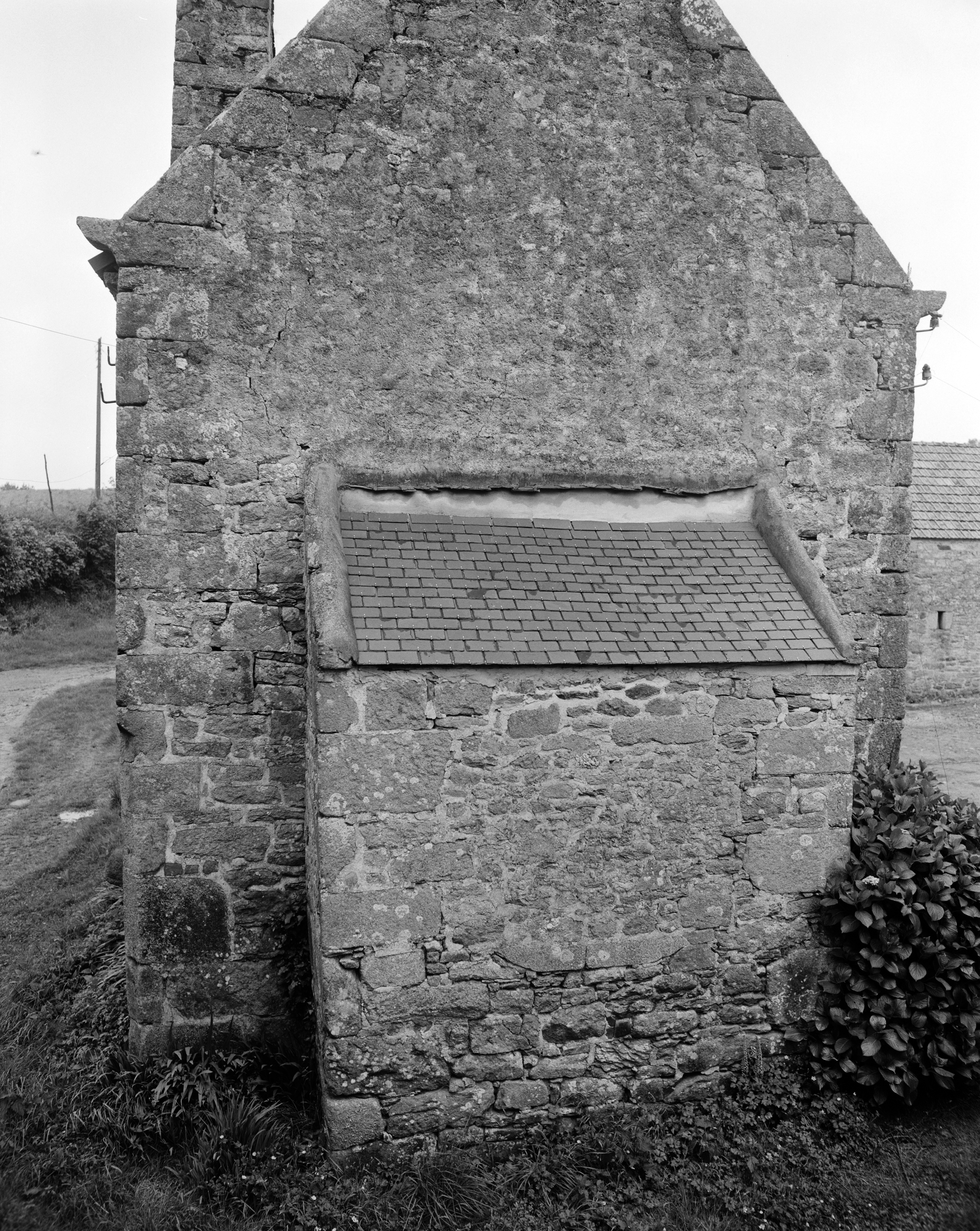 Manoir, logis : mur-pignon ouest avec le kuz-gwele au premier plan (état en 1986)Immatriculation