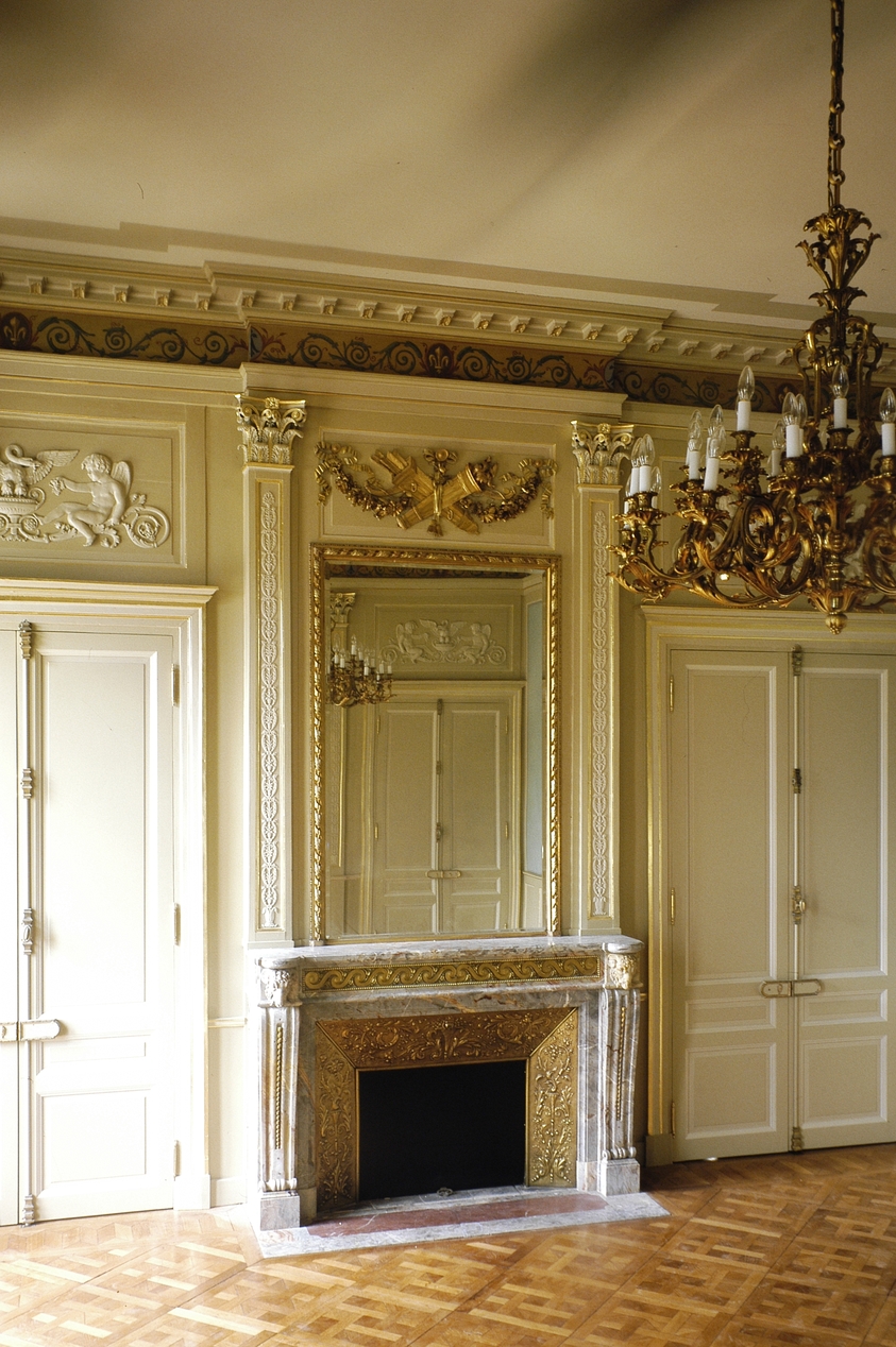 Grand salon, vue générale mur ouest avec la cheminée.Immatriculation