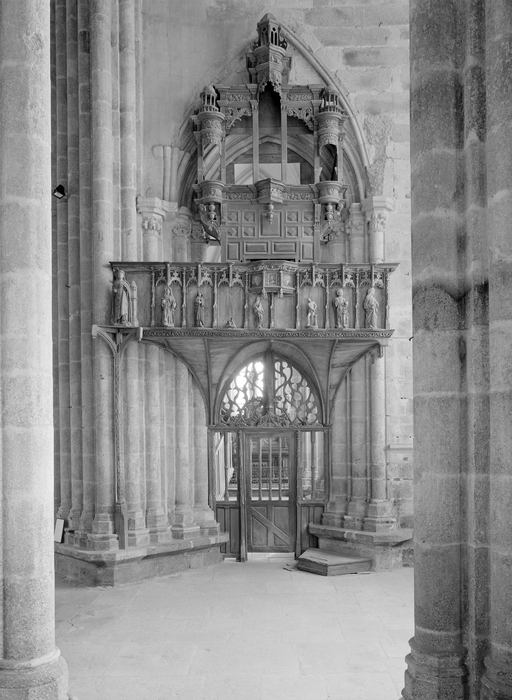 Orgue en tribune (ancien jubé) dans un transept - Vue générale de l'ensemble buffet et tribune jusqu'au sol.Immatriculation
