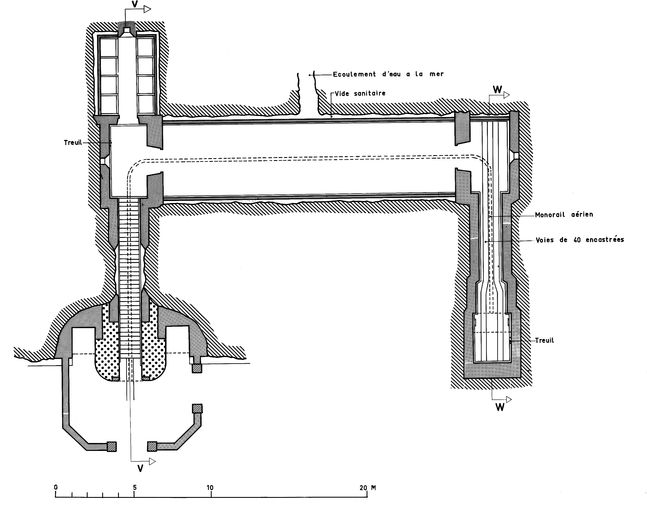 Plan du magasin à poudre sous roc des batteries des Capucins à Roscanvel (escalier, voie ferrée de 40 cm encastrée, treuil, monorail aérien, vide sanitaire, écoulement d'eau à la mer)Immatriculation