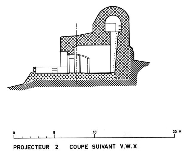 Groupe de 2 projecteurs de 60 cm et 90 cm et usine électrique, au ras de l'eau, Pointe Robert (Roscanvel),