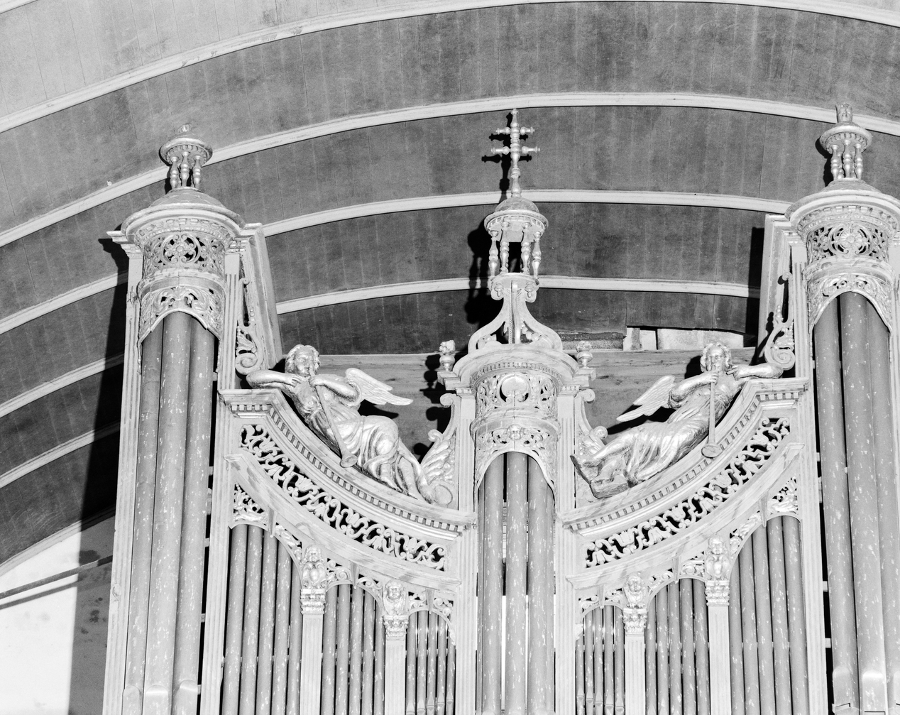 Entablement supérieur incurvé avec son décor d'anges musiciens.Immatriculation