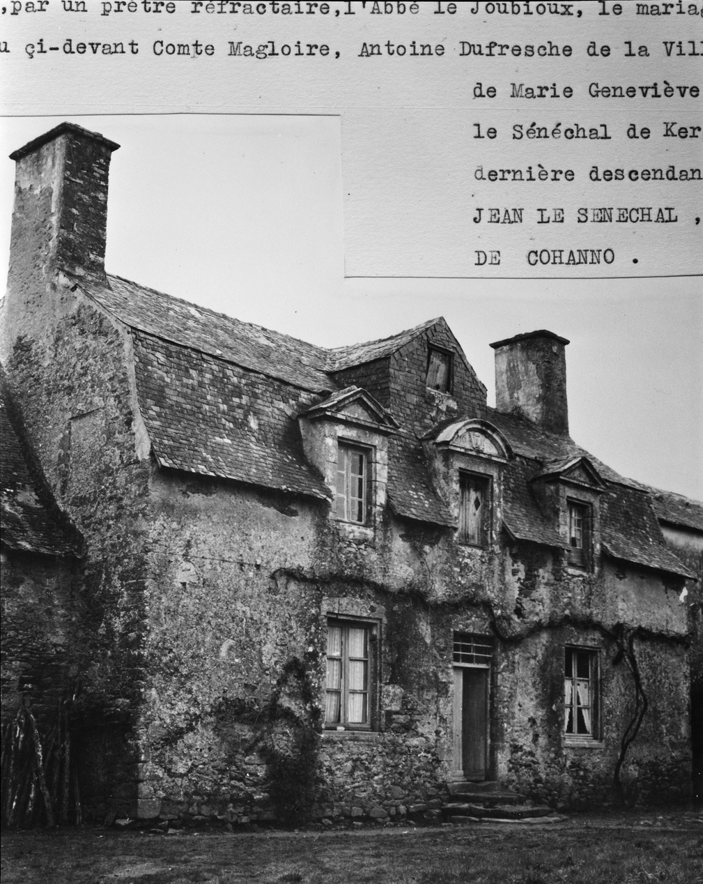 Manoir dit manoir de Kohanno Kozh, logis, élévation ouest, état vers 1960 (Doc. de Langlais).Immatriculation
