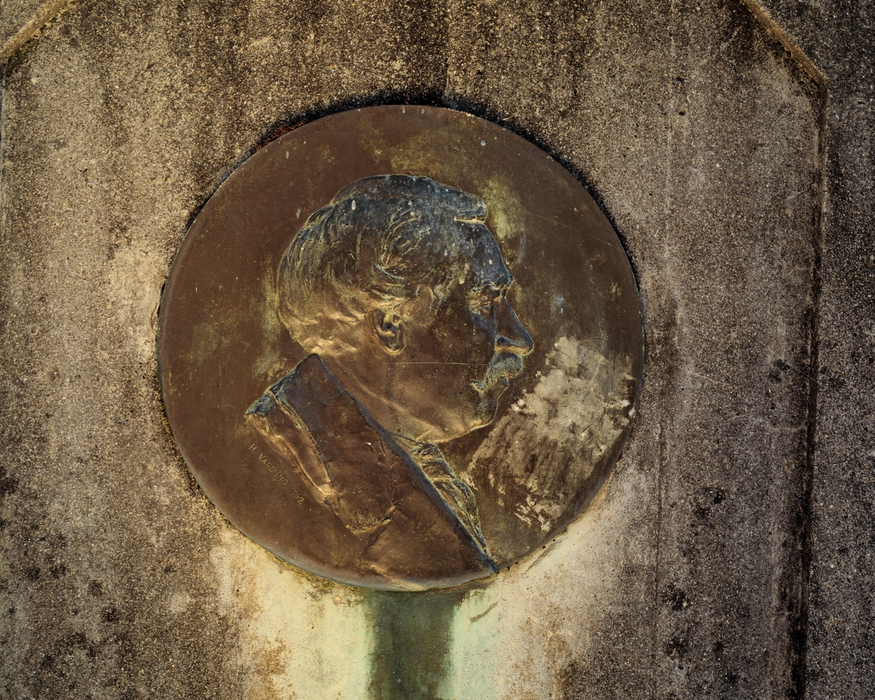Médaillon de bronze, situé côté ville, signé H. Varenne 1922 (état en 1988)Immatriculation