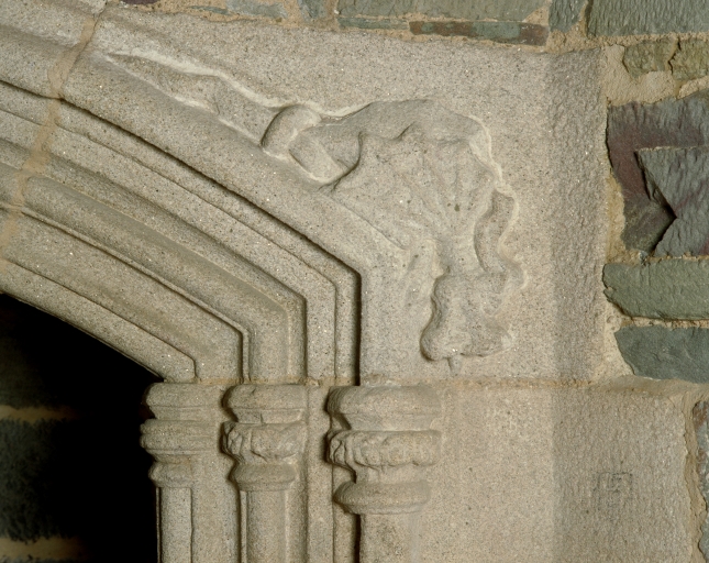 Tour de Papegaut, premier étage : cheminée, détail chapiteaux, moulures et dragon sculptéImmatriculation