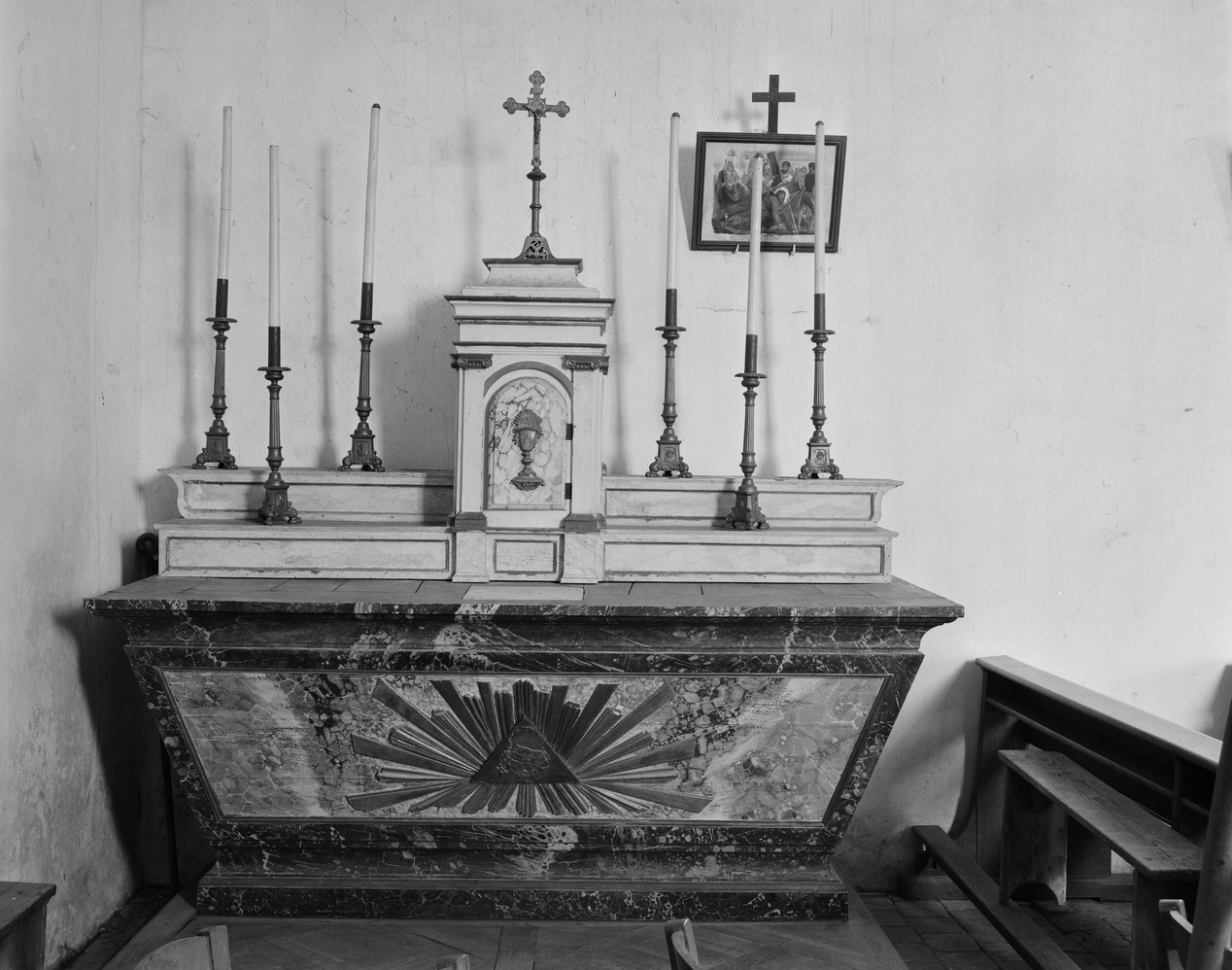 Autel, tabernacle, gradins, nef mur sud, vue générale.Immatriculation
