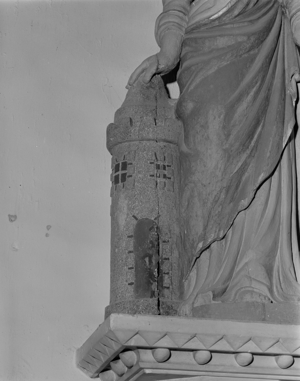 Statue sainte Barbe, détail de la tour.Immatriculation