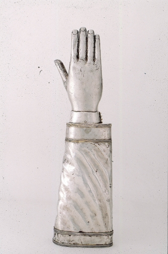 Bras reliquaire, premier quart 15e siècle et 1540. Argent sur âme de bois, cabochon de cristal et fausses pierres, (Classé M.H.). Vue générale du reversImmatriculation