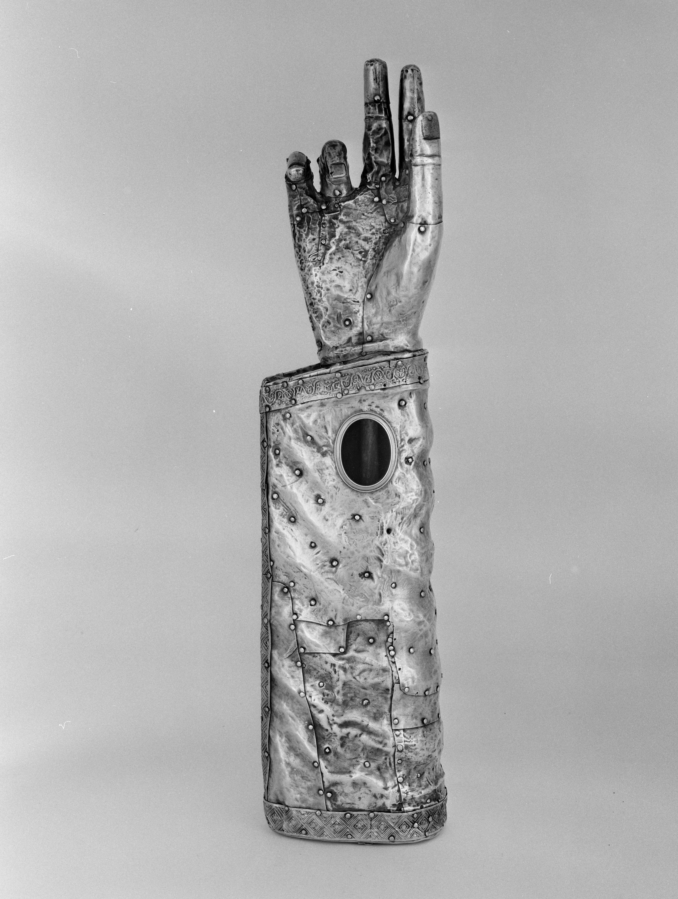 Bras-reliquaire vu du côté de la paume de la main (état en 1990)Immatriculation