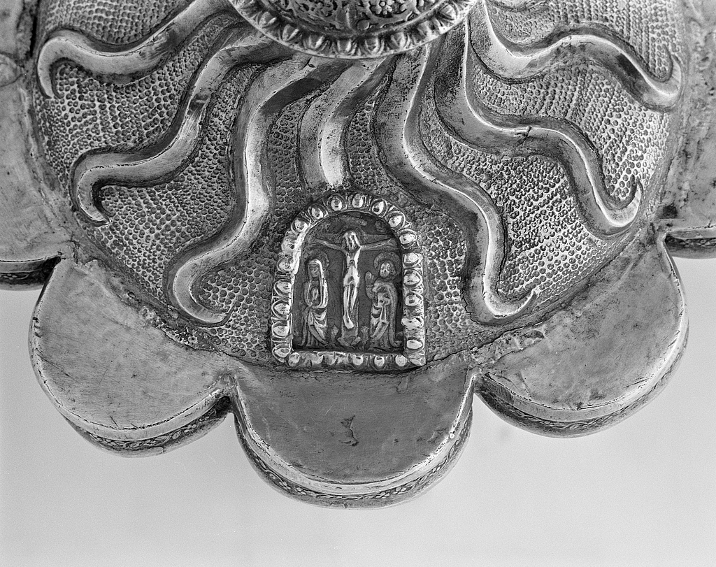 Détail du pied : médaillon de la Crucifixion.Immatriculation