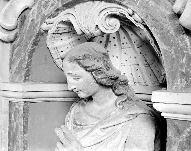Détail de la tête de la statue de Saint-Jean-Evangéliste (profil).Immatriculation